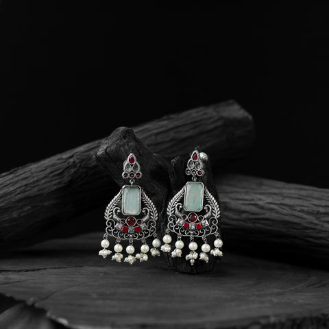 Oxidised handcrafted earrings made with a blend of metal, stones, pearls, beads, and fine detailing. Perfect for festive occasions, weddings, casual outings, office wear, or vacations. Their elegant black and silver tones pair beautifully with everything from casual jeans and flowy dresses to chic office ensembles. A meaningful gift for mother, sister, wife, or girlfriend adding a beautiful touch of tradition to every moment.