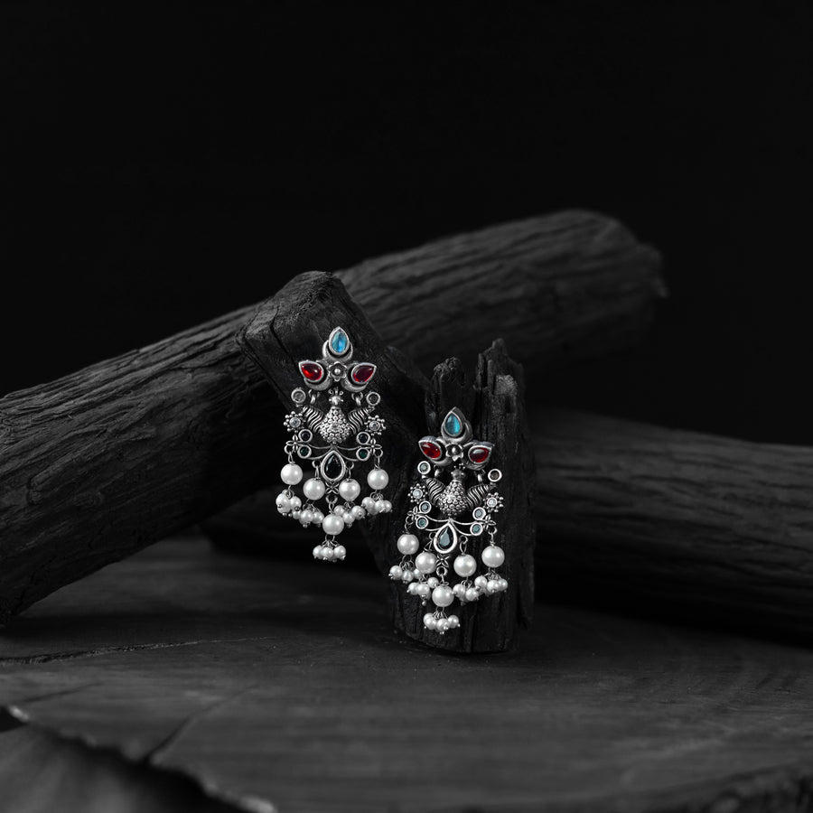 Saanjh Bela Multicolor Peacock Pearls Oxidised Earrings