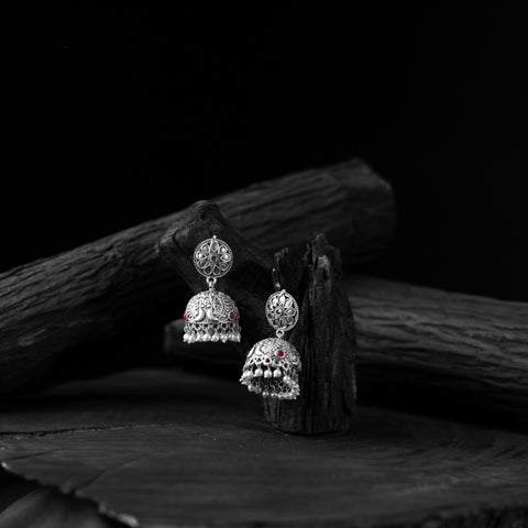 Oxidised handcrafted jhumka earrings made with a blend of metal, stones, pearls, beads, and fine detailing. Perfect for festive occasions, weddings, casual outings, office wear, or vacations. Their elegant black and silver tones pair beautifully with everything from casual jeans and flowy dresses to chic office ensembles. A meaningful gift for mother, sister, wife, or girlfriend adding a beautiful touch of tradition to every moment.