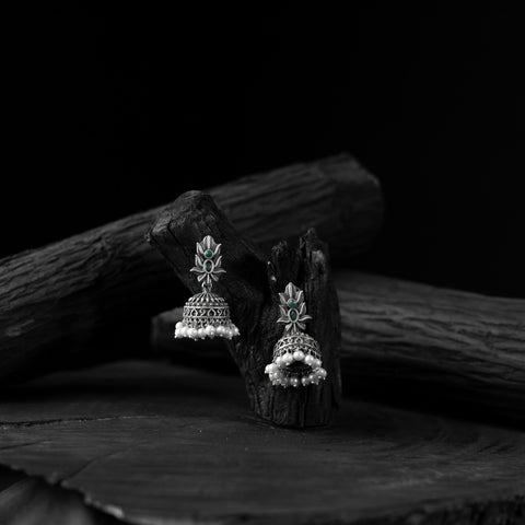 Oxidised handcrafted jhumka earrings made with a blend of metal, stones, pearls, beads, and fine detailing. Perfect for festive occasions, weddings, casual outings, office wear, or vacations. Their elegant black and silver tones pair beautifully with everything from casual jeans and flowy dresses to chic office ensembles. A meaningful gift for mother, sister, wife, or girlfriend adding a beautiful touch of tradition to every moment.