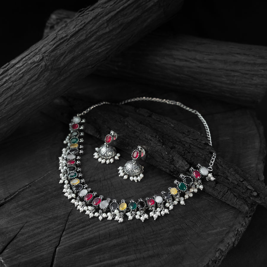 Oxidised handcrafted necklace set features intricate detailing using varied materials like metal, stones, pearls and artistic motifs. Perfect for festive occasions, weddings, office wear or casual styling it pairs beautifully with sarees, kurtas, or contemporary outfits. Complete with matching earrings, this set makes for a thoughtful gift for mother, sister, wife, or girlfriend adding beauty and grace to every special moment.