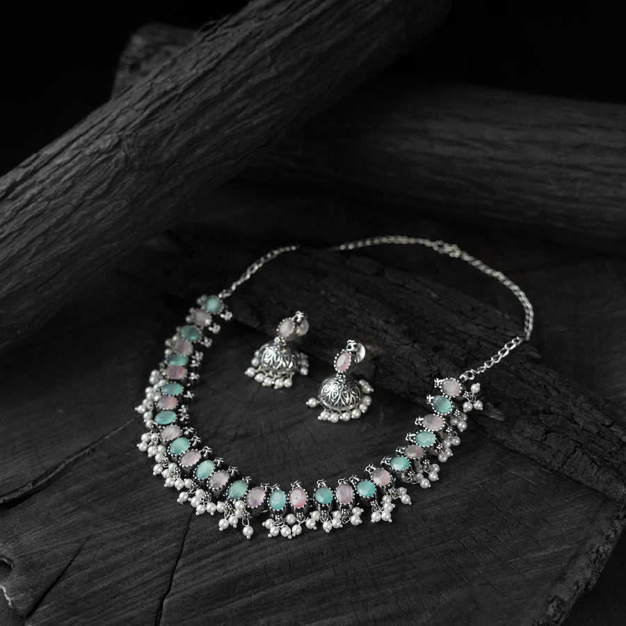 Saanjh Bela Pink & Green Oval Oxidised Necklace Set