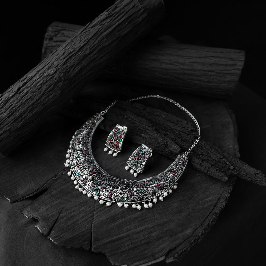 Saanjh Bela Ruby & Green Floral Oxidised Necklace Set
