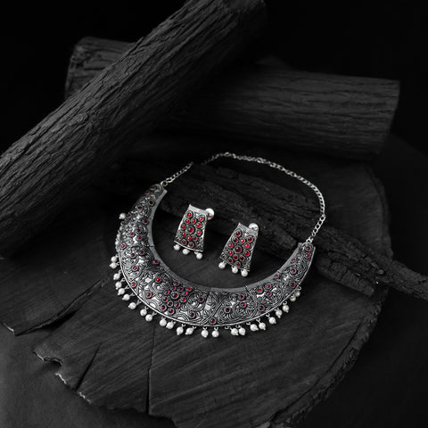 Saanjh Bela Ruby Floral Oxidised Necklace Set