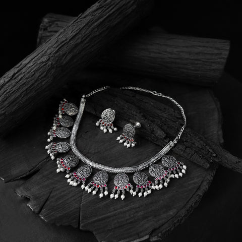Oxidised handcrafted necklace set features intricate detailing using varied materials like metal, beads, and artistic motifs. Perfect for festive occasions, weddings, office wear, or casual styling, it pairs beautifully with sarees, kurtas, or contemporary outfits. Complete with matching earrings, this set makes for a thoughtful gift for mother, sister, wife, or girlfriend adding beauty and grace to every special moment.